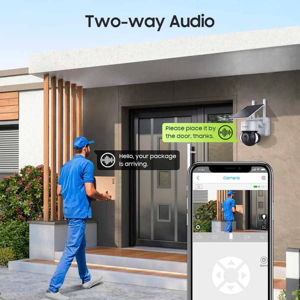كاميرا SHIWOJIA الشمسية الخارجية هي كاميرا مراقبة عالية الجودة تعمل بالطاقة الشمسية، مثالية للمراقبة في الهواء الطلق. تتميز بدقة 3 ميجابكسل، مما يضمن لك صورة واضحة وحادة. تحتوي على بطارية مدمجة تعمل بالطاقة الشمسية بفضل الألواح الشمسية بقدرة 6 وات، مما يجعلها صديقة للبيئة وتعمل بشكل مستمر دون الحاجة لتوصيلها بالكهرباء. الكاميرا مزودة بخاصية الرؤية الليلية الملونة، مما يتيح لك مراقبة فعالة في الظلام. بفضل الاتصال عبر Wi-Fi، يمكنك مراقبة المنطقة المراقبة عن بُعد من خلال هاتفك المحمول أو جهاز الكمبيوتر. هذه الكاميرا مثالية لمراقبة الحديقة، الفناء أو أي مكان خارجي آخر، مع توفير طاقة مستدامة ومنخفضة التكلفة.