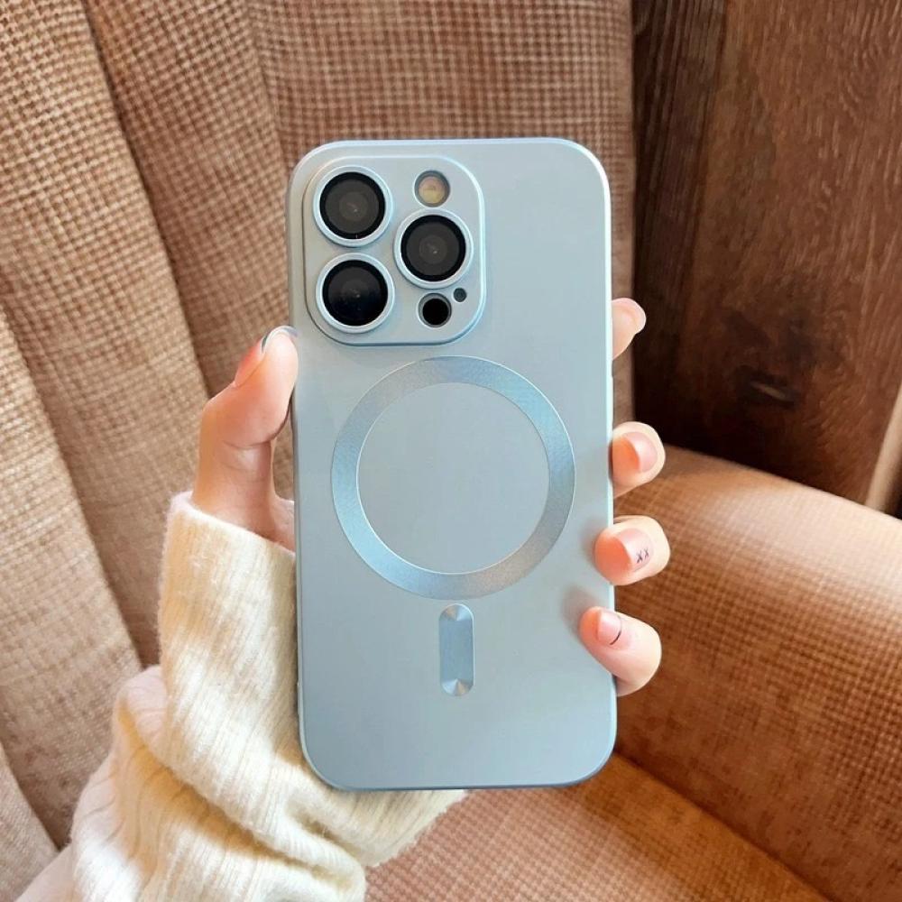 حافظة شحن لاسلكية Magsafe للهاتف iPhone 16، 15، 14، 13، 12، 11 Pro Max، تتميز بتصميم مغناطيسي ناعم يوفر حماية قوية وجمالية في آن واحد. الحافظة تدعم الشحن اللاسلكي بشكل كامل بفضل تقنية Magsafe، مما يسمح بشحن سريع وآمن دون الحاجة لإزالة الغطاء. تتميز باللون الأسود الأنيق الذي يضيف لمسة من الفخامة للهاتف، مع حماية مقاومة للصدمات والخدوش. تصميمها المغناطيسي يضمن تثبيت الهاتف بشكل محكم أثناء الاستخدام.